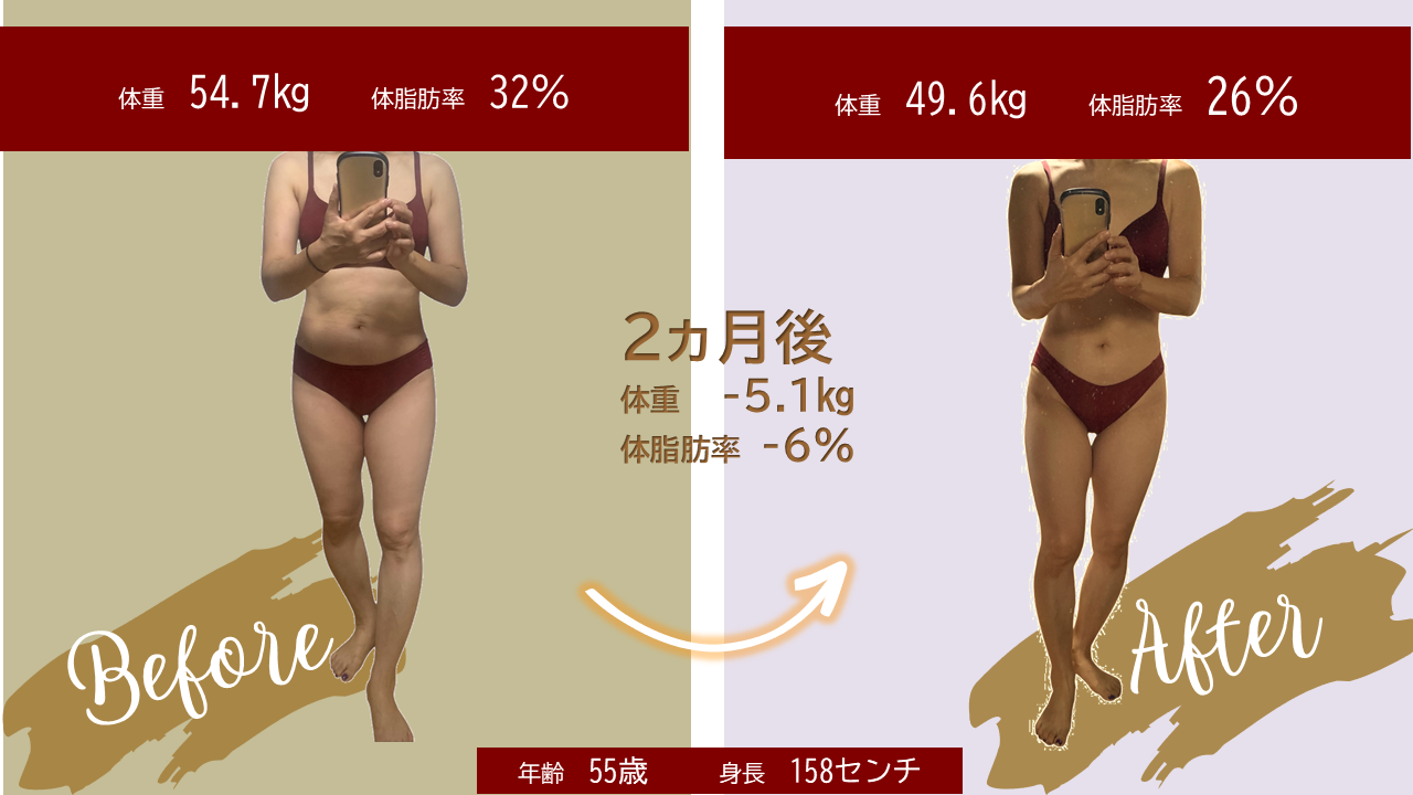 食事の管理を日々徹底して行いました。週に3回、1時間程度の筋トレを継続した結果、筋肉を減らすことなく、脂肪だけが減る良い結果となりました。